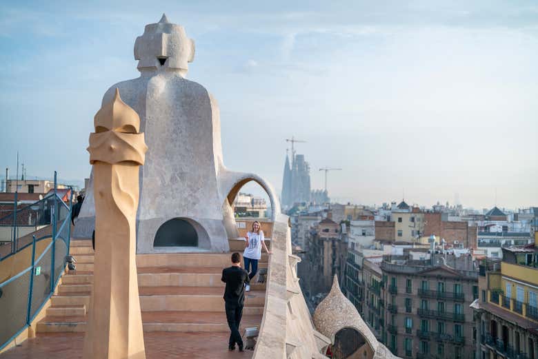 Finally, we'll go up to The Warrior Rooftop, where the famous chimneys representing the warriors and guardians of La Pedrera await us. From here, you'll also have breathtaking views of Barcelona.