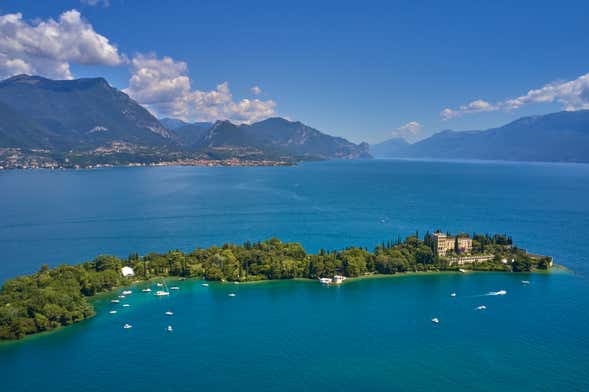 As we travel through this stunning lake, which lies between the regions of Veneto and Lombardy, we'll soon arrive at Garda Island. We'll approach the shore so you can see the charming 19th-century villa that stands on the eastern side of the island. This Venetian neo-Gothic mansion was designed by the architect Luigi Rovelli, and you'll have plenty of time to take pictures of it.