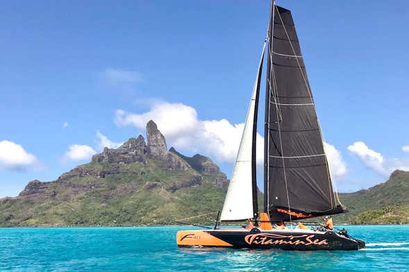 At 9 am we'll pick you up at your hotel in Bora Bora. From there we'll transfer you by speedboat to the catamaran and tour around the impressive blue lagoon.
