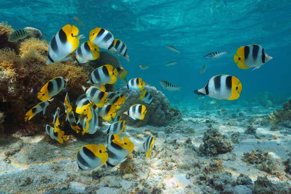 We'll start sailing in the Blue Lagoon, keeping an eye out for the sea creatures that live here. As we cruise around the island, you'll be able to see tropical, colourful fish and huge coral formations. Plus, if we're lucky we may see manta rays, sea turtles and even sharks.