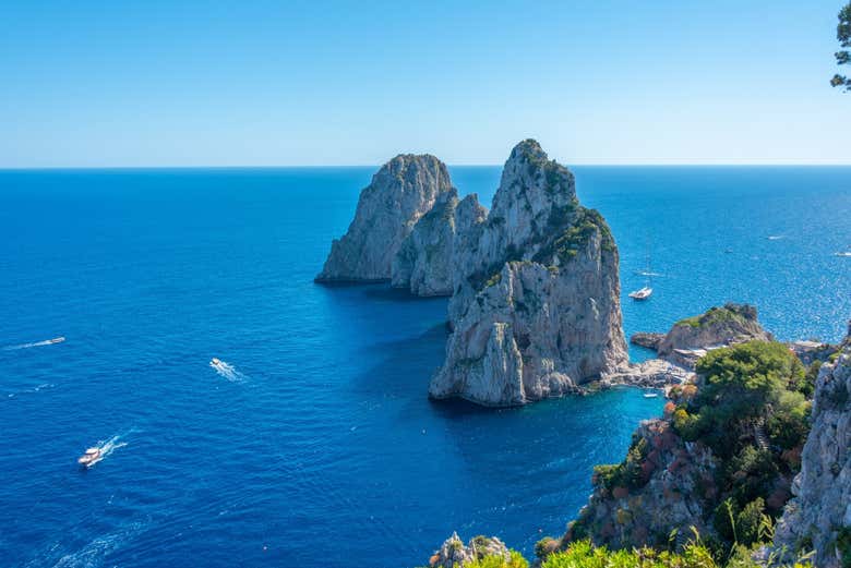 We'll continue sailing toward Villa Malaparte, one of the most iconic structures of the area, and the Faraglioni, three famous rock formations that are a symbol of the island. Don't forget to take a picture!