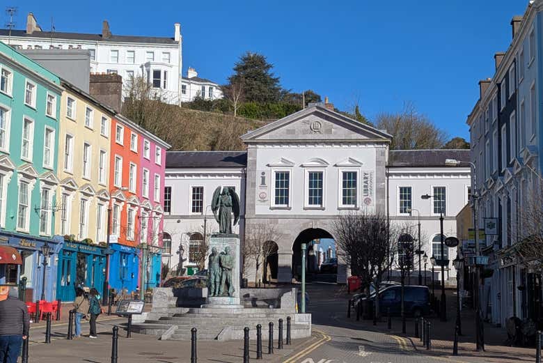 Our next stop is Casement Square and the Lusitania Memorial. In this colourful square, surrounded by houses painted in shades of pink, yellow, red or blue, we'll tell you the story of the Lusitania, the ship sunk by a German torpedo during the First World War.