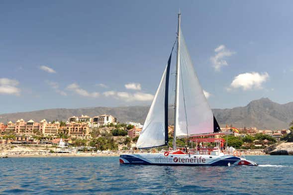 At the indicated time, we'll meet at the port of Colón, located in the town of Costa Adeje. We'll board an eco-catamaran and start sailing along the west coast of Tenerife in search of the whale and dolphin families that inhabit this part of the Atlantic Ocean.
