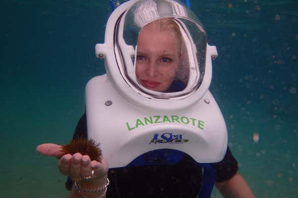 Following a brief training of 10 minutes, we put on all the necessary equipment (mask and wetsuit) to enjoy our underwater tour! Over half an hour we'll enjoy the breathtaking experience of walking on the seabed, observing the sea and plant life of the Lanzarote shallows. We'll have the same view as a diver, but without the need for a licence or previous experience!
