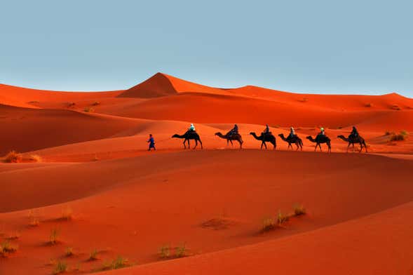 As the sun sets, hop on a camel and marvel at the endless golden dunes as you're rocked from side to side. Your destination is a traditional desert camp, where you'll enjoy a delicious Moroccan meal and fall asleep under the stars in a comfortable Amazigh tent.