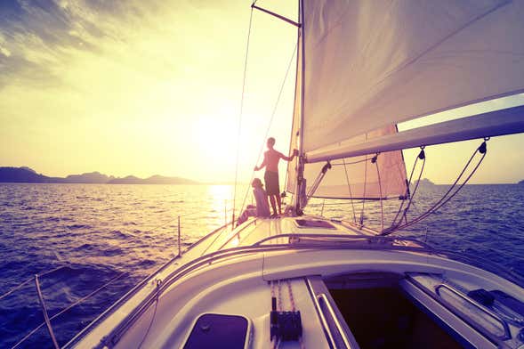 Then we'll set sail again as dusk begins to fall, and the sun begins to set over the horizon, reflecting auburn tones off the sparkling blue sea.