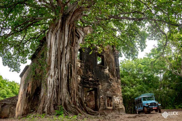 We follow the itinerary to Coqueiral, a place full of coconut trees standing next to the Atlantic. From here we'll walk to the ruins of the church of Bonsucesso, a building of the Carmelite Order. Nature has merged with the limestone and sandstone of its walls, and a large gameleira tree forms part of the site.