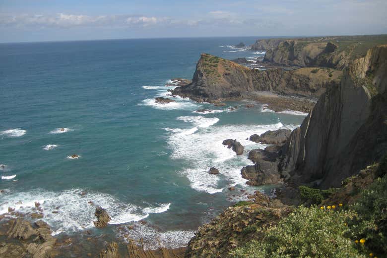We will travel through part of the Southwest Alentejo and Vicentine Coast Natural Park, which extends from Vila Nova de Milfontes to Burgau. First, we'll make a stop at the beaches of Amado and Carrapateira, two large stretches of sand known for their huge Atlantic swells.