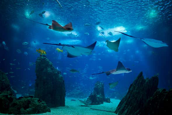 During approximately 2 hours, you'll discover among many rooms the main attraction of the aquarium's permanent exhibition: a large central tank where tuna, seahorses, unicorn fish, and many more species that live in the ocean swim. Did you know that the aquarium's tanks contain 7 million liters of water? Impressive!