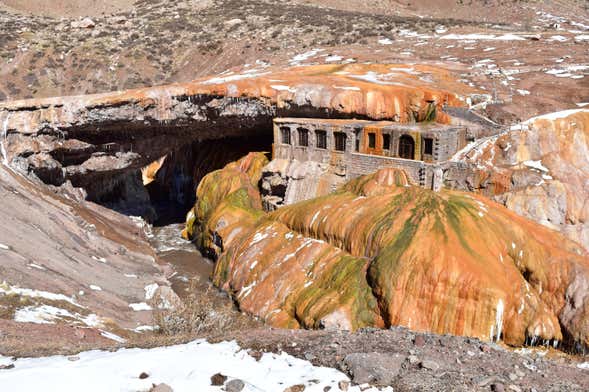 Then we'll continue on to Puente del Inca, a natural bridge formed from rock that crosses over the Las Cuevas river. Nearby, you'll come across a viewpoint offering you stunning vistas of the iconic Aconcagua.