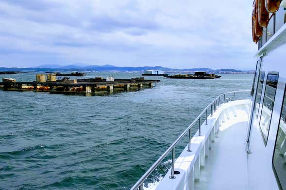 On board the boat, you'll taste steamed mussels, oysters with a vinaigrette sauce, rice with seafood and for dessert, Santiago cake or fruit if you come during July, August or September. All this accompanied by Galician wine, water or soft drinks. Plus, to finish off this feast, you can toast with a shot of crema de orujo, a delicious creamy liquor!