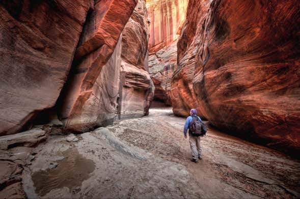 After an hour-long drive, we'll arrive at the start of our hike around Buckskin Gulch Canyon. This gorge pass, located on the border between Utah and Arizona, goes through a huge canyon which, due to its high concentration of sandstone, is known for its intense red colour.