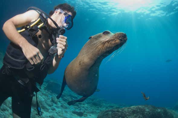 For the next 45 minutes, we'll explore the seabed, accompanied by some of the friendliest mammals in the world - wonderful sea lions! You'll see these beautiful creatures, completely free in their natural habitat. You'll even meet them up close and interact with them. This is a once-in-a-lifetime experience that you'll never forget!