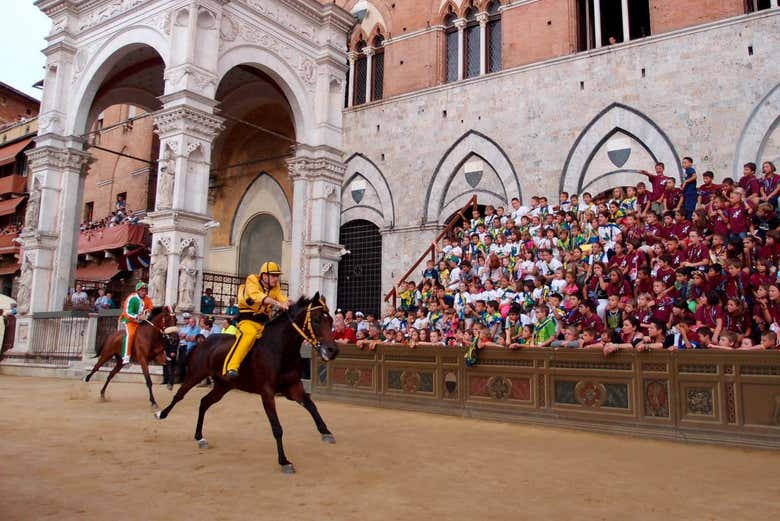 As we walk around the square, we'll learn about the medieval origins of these equestrian competitions, in which the contradas (districts) of Siena compete against each other. Each rider wears a uniform with the colors of their district and competes for the pallium, a painted banner made of silk, from which the race gets its name. There is no greater honor for a jockey representing his contrada than to receive the winner's pallium.