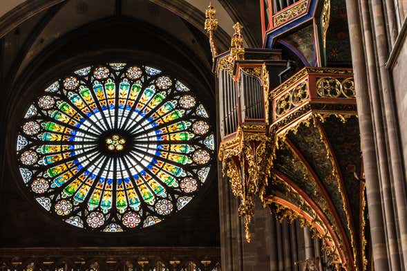 Before entering, we'll direct our gaze to the facade of the cathedral. The Strasbourg Cathedral stands out because of its well-preserved, hundreds of sculptures. You'll also see its enormous tower that reaches 465 feet (142 meters) high! We'll explain how it was constructed over the centuries and interesting facts about its architecture.