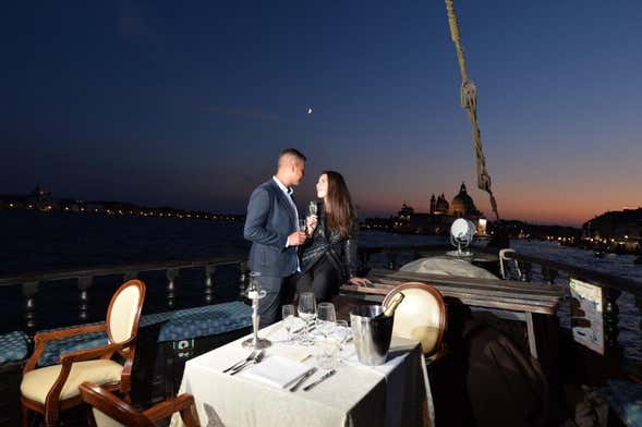 When booking, you can choose whether you want to enjoy a menu with fish, the specialty of the Venetian Galleon, a menu with meat or a vegetarian menu. All include several starters, first and second courses, dessert, water, and, for every two adults, a bottle of Veneto wine.