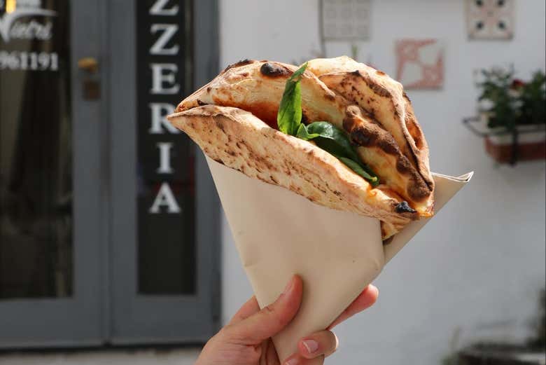We'll continue walking through Vietri sul Mare and arrive at a small square, where an authentic Neapolitan street food awaits, the portafoglio pizza. Did you know portafoglio pizza means "wallet pizza" because it's folded like a closed wallet? Of course, this tour wouldn't be complete without one of the most iconic dishes of the Amalfi coast's street food, the seafood cuoppo, a cone with the fried fish of the day.